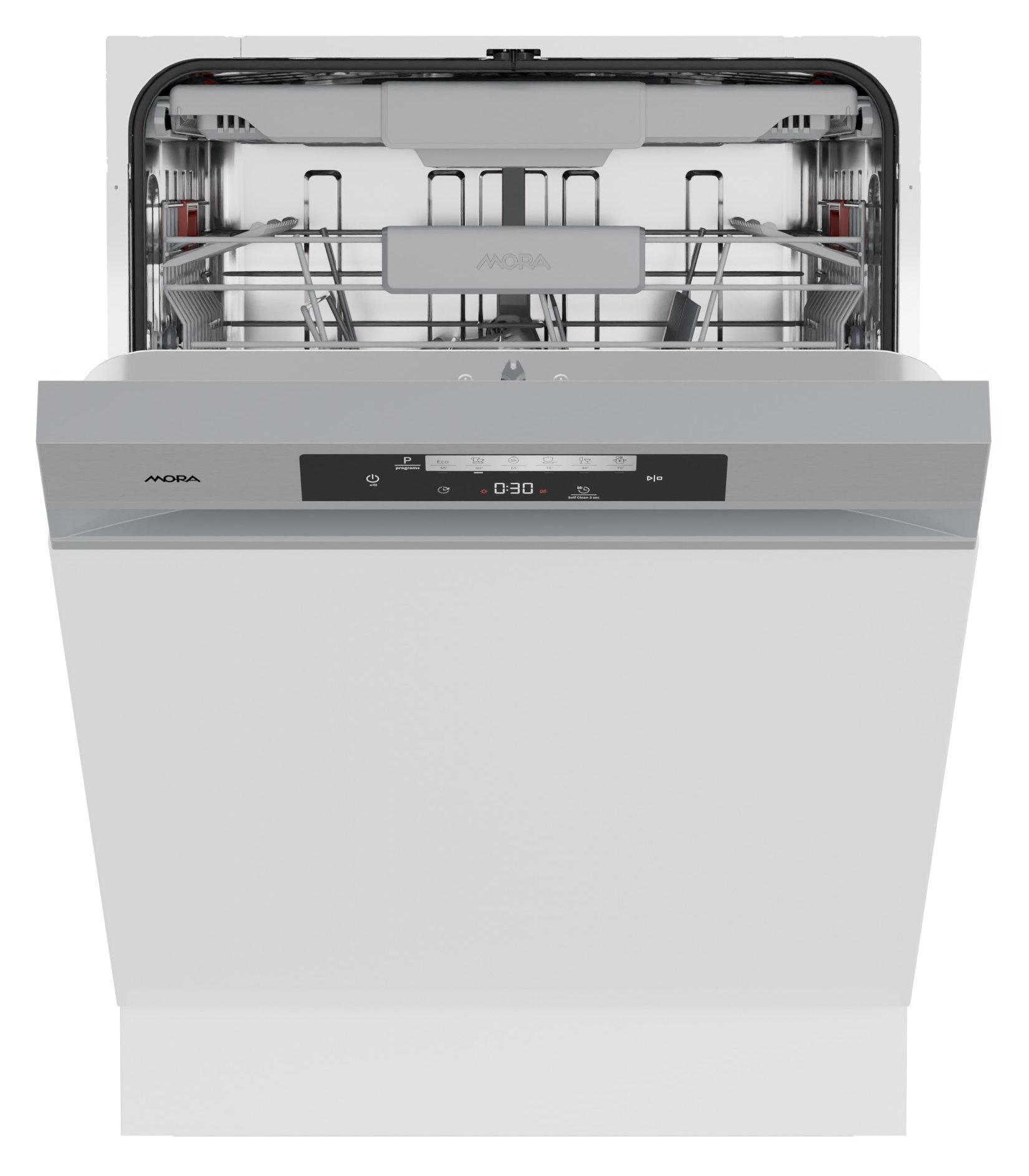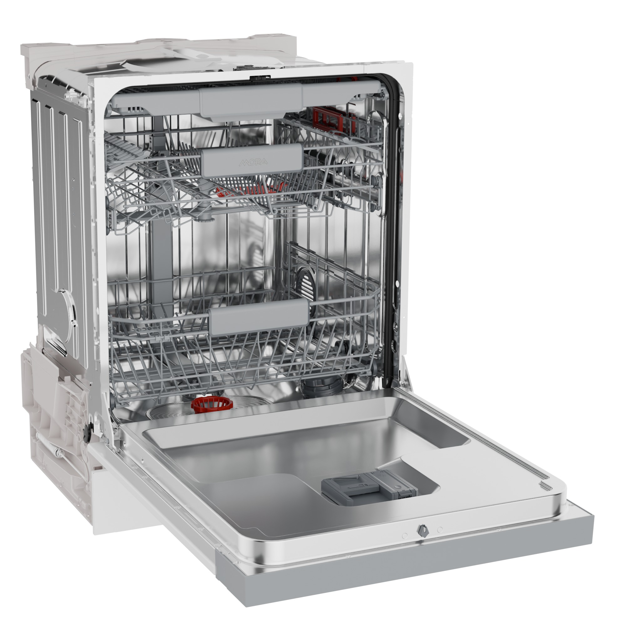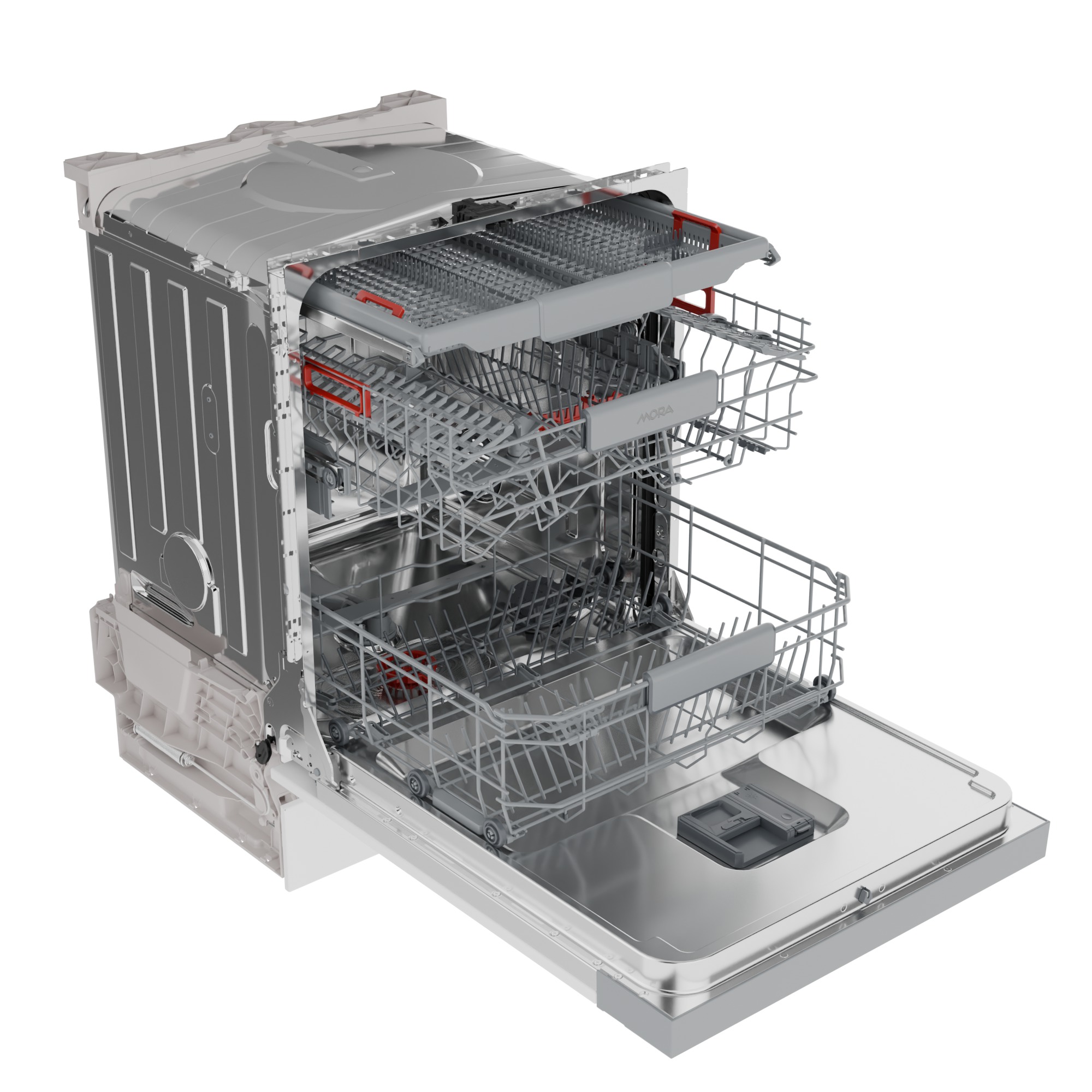 Myčky MORA s kapacitou až 16 jídelních souprav disponují 3 koši se zvýrazněnými pohyblivými prvky, díky kterým můžete jednoduše přizpůsobit interiér koše podle aktuálních potřeb. Horní koš můžete zvednout i při plném naložení, takže získáte prostor pro vložení i objemných hrnců, pekáčů nebo servírovacích podnosů. Příbory lze perfektně uspořádat v příborové zásuvce, kde se vzájemně nepoškrábou a mohou se dokonale vysušit.