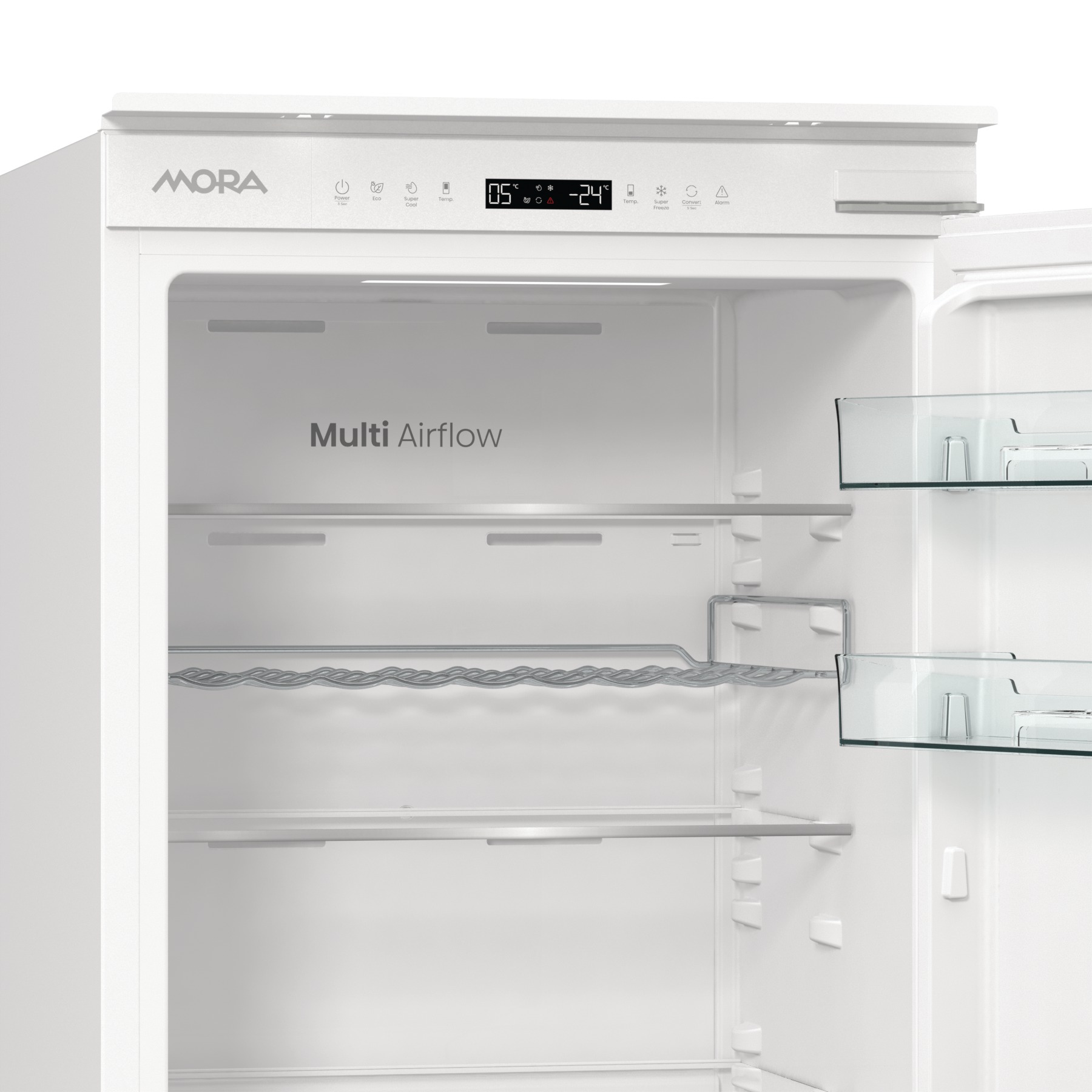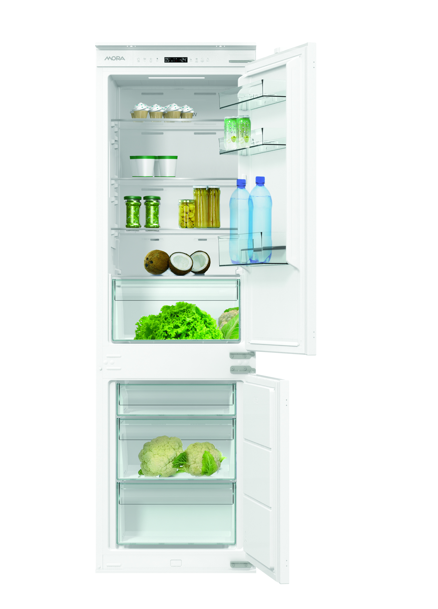 Vestavná kombinovaná chladnička MORA VCMDN 3024 je navržena tak, aby vám každý den usnadnila život a zároveň uchovala vaše potraviny déle čerstvé. Díky elektronickému ovládání s přehledným LED displejem jednoduše nastavíte ideální teplotu pro chladničku i mrazničku – a aktivujete i praktické režimy jako rychlé chlazení, rychlé mrazení nebo úsporný EcoMode během vaší nepřítomnosti. Technologie NoFrost Dual vás zbaví nutnosti zdlouhavého odmrazování – chladný vzduch proudí rovnoměrně, snižuje vlhkost a brání tvorbě ledu na stěnách i potravinách. Díky technologii CoolSense se chladnička přizpůsobí vašim návykům – rozpozná, jak často otevíráte dvířka, a automaticky upravuje teplotu tak, aby potraviny zůstaly čerstvé co nejdéle a spotřeba energie byla co nejnižší. Funkce CoolConvert přináší praktickou flexibilitu, kdykoli potřebujete více prostoru pro nápoje nebo občerstvení – jedním dotykem proměníte mrazák na chladničku nebo velkou nulovou zónu. Invertorový kompresor zajišťuje tichý chod, stabilní teplotu a nižší spotřebu energie – ideální pro moderní, úspornou domácnost. Díky systému Multi AirFlow proudí chladný vzduch rovnoměrně po celém prostoru, takže vaše potraviny jsou správně uchované bez ohledu na to, kam je uložíte. Objemná zásuvka VitaBox vytváří ideální podmínky pro dlouhodobé uchování čerstvého ovoce a zeleniny – plného chuti i vitamínů. Chladnička se snadno přizpůsobí vaší kuchyni – dvířka umožňují změnu směru otevírání a výškově nastavitelné skleněné police jsou dostatečně odolné i pro velké hrnce a těžší potraviny. Extra tichý provoz je velkou výhodou – chladnička je ideální i do kuchyně propojené s obývacím pokojem nebo jídelnou. Její chod je téměř neslyšitelný, takže vás nebude rušit ani v noci.