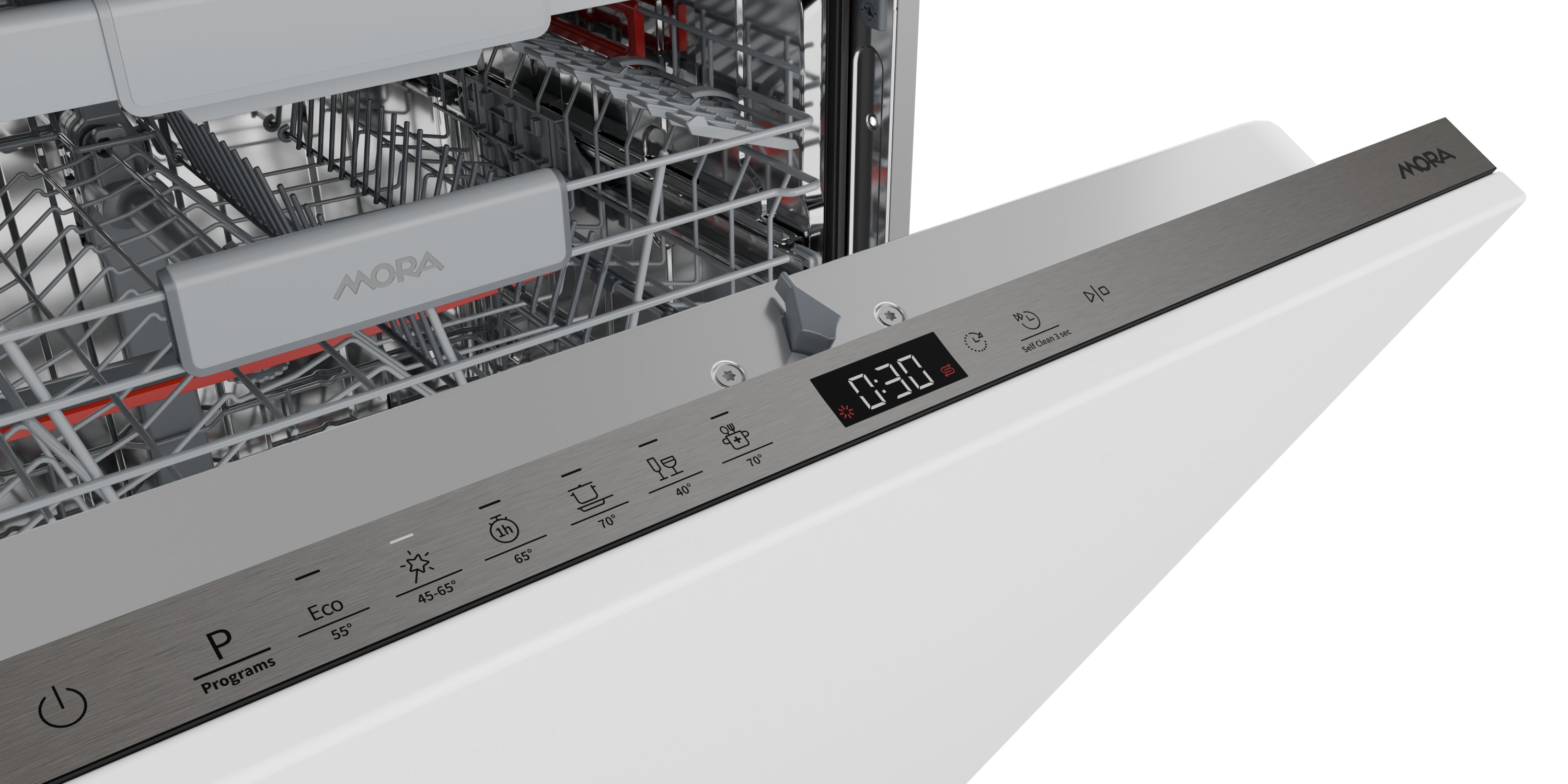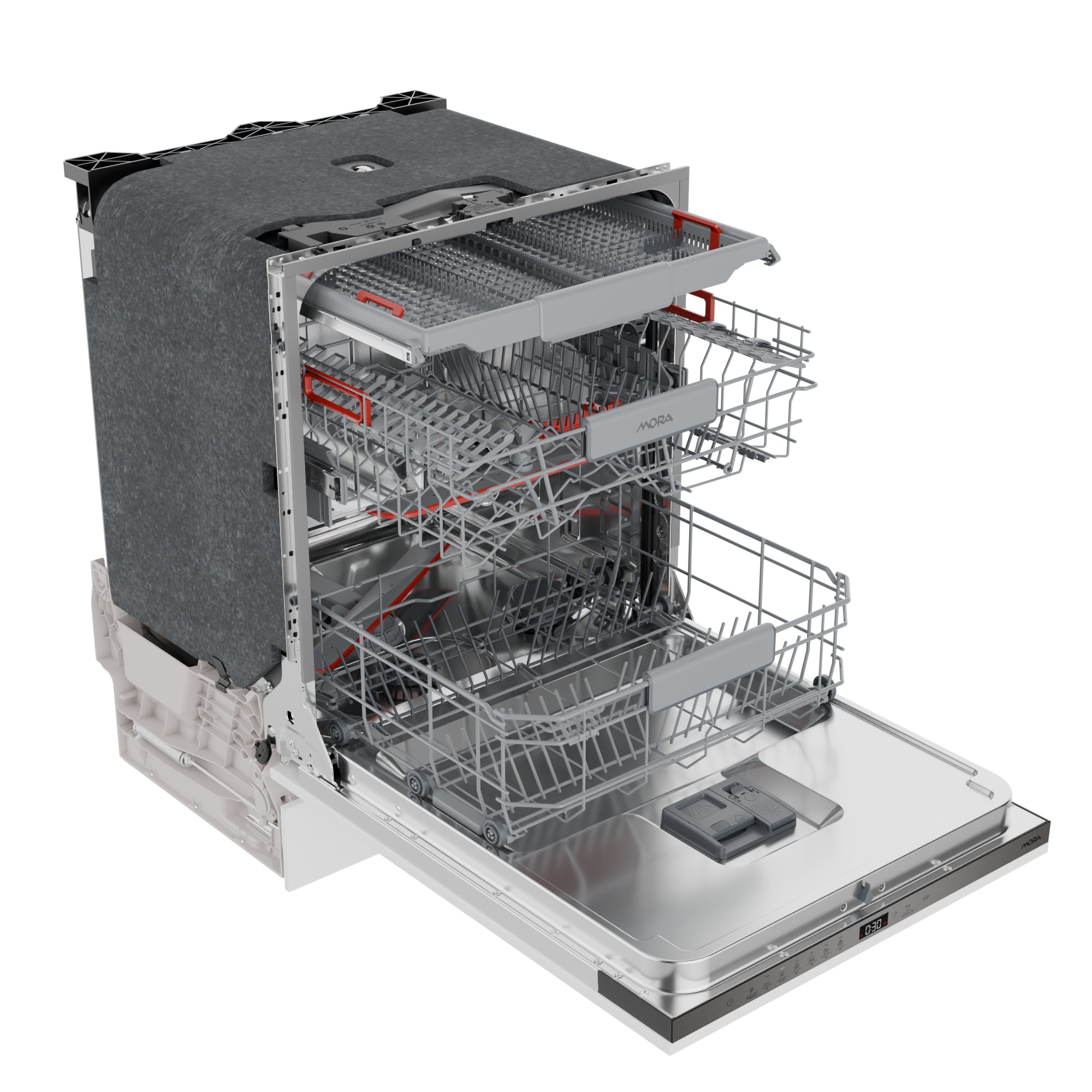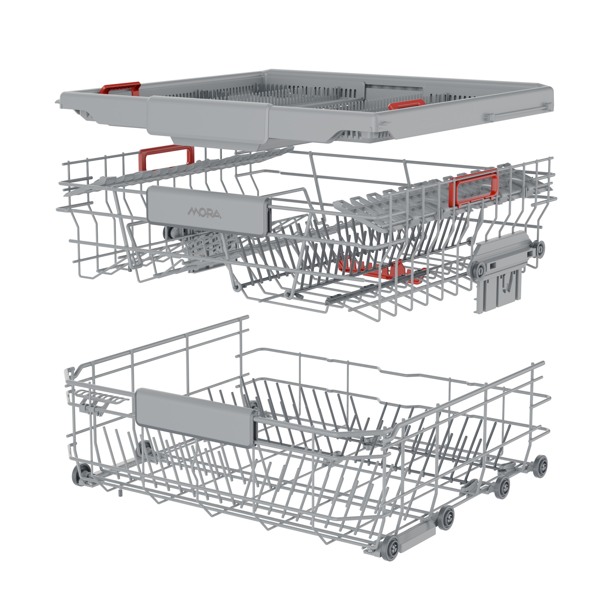 Myčky MORA s kapacitou až 16 jídelních souprav disponují 3 koši se zvýrazněnými pohyblivými prvky, díky kterým můžete jednoduše přizpůsobit interiér koše podle aktuálních potřeb. Horní koš můžete zvednout i při plném naložení, takže získáte prostor pro vložení i objemných hrnců, pekáčů nebo servírovacích podnosů. Příbory lze perfektně uspořádat v příborové zásuvce, kde se vzájemně nepoškrábou a mohou se dokonale vysušit.