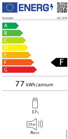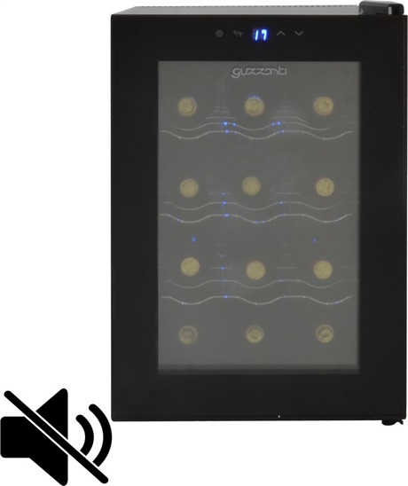 hlučnost do 25 dB, kapacita 12 láhví, 37l netto, 3 chromové drátěné police, bez kompresoru, bez CFC, spotřeba 0,21kWh/24, Max. příkon 65 W, vnitřní modré LED osvětlení, barva černá, Rozměry V x Š x H(cm): 52,9 x 36 x 55
