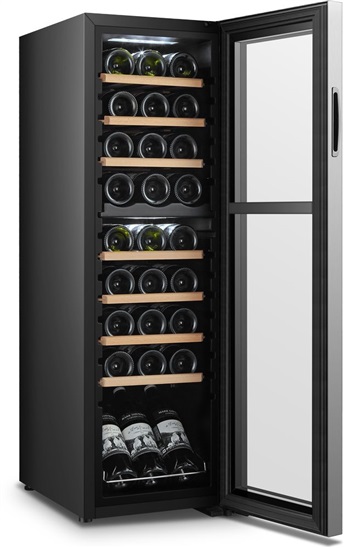 Dvě nezávislé duální teplotní zóny pro 27 láhví,elektronické ovládání s LED displejem a digitálním termostatem, 7x dřevěné police, Automatické odmrazování, Spotřeba 0,42 kWh/24h, Max. hlučnost do 47dB, Nastavitelné nožičky