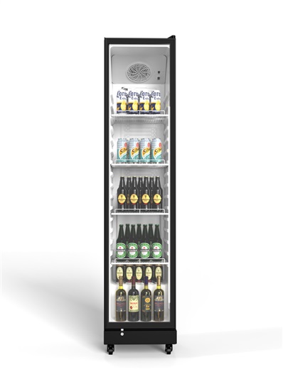 Volně stojící chladící vitrína o objemu 235 l a s 4 drát. policemi; Objem netto 235 l; 4x poloh. police; ventilované chlazení; s kompresorem a eko chladivem R 600a bez CFC; termostat s rozsahem chlazení už od 0°C do +10°C; vnitřní LED osvětlení; 4 kolečka pro snadný přesun