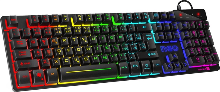 Profesionální gamingová klávesnice NEO series pro hráče počítačových her v českém a slovenském layoutu s celkem 9 módy barevného rainbow podsvícení a čtyřstupňovou regulací intenzity podsvícení. K dispozici je 12 multimediálních kláves. Pozlacený USB konektor pro maximální konektivitu.