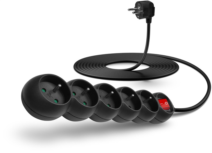 Prodlužovací kabelový přívod na 230V je vybaven dětskou ochranou všech zásuvek. Díky pootočení zásuvek o 45° je možné používat i objemnější napájecí adaptéry nebo úhlové koncovky. Možné zavěšení nebo pevná instalace na stěnu. Max. příkon spotřebičů až 2500 W. Testováno a certifikováno v Evropě.