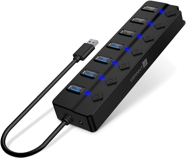 USB-A Hub, 4xUSB-A 3.0, 3xUSB-A 2.0, porty s ON/OFF switchem, LED indikátor zapnutí/vypnutí u každého portu, Snadná instalace Plug & Play, Podpora připojení 2.5" disků, Délka kabelu: 25 cm, Barva: černá