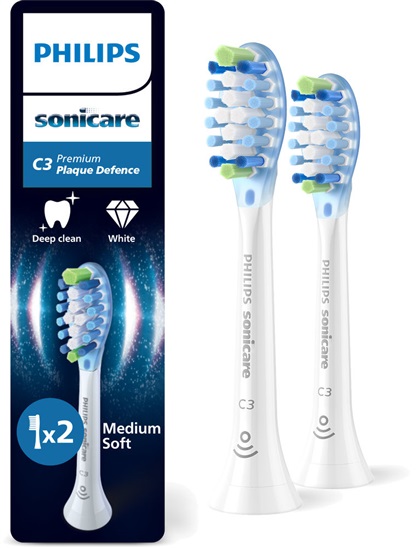2x Náhradní hlavice Premium Plaque Defence pro zubní kartáček Philips Sonicare, efektivní odstranění zubního plaku a povrchových skvrn, sonický stíravý pohyb, párování režimů BrushSync, kompatibilní s modely Philips Sonicare