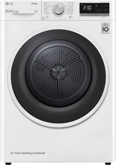 9 kg, energetická třída D, s tepelným čerpadlem, LED display, funkce EcoHybrid (volba úspory času / energie), Automatické čištění kondenzátoru, LG ThinQ + Wifi, Duální Invertorový motor a kompresor (10 let záruka), LED osvětlení bubnu, hlučnost 64 dB, program pro alergiky.