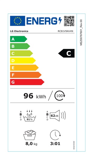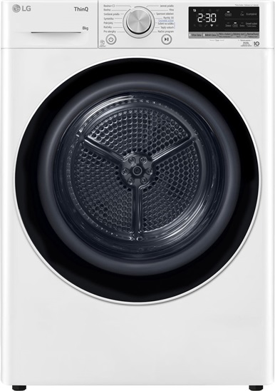 Sušička prádla; energetická třída C; kapacita 8 kg; hlučnost 62 dB; 14 programů; Duální invertorové tepelné čerpadlo a invertorový motor; Program Pro alergiky; Automatické čištění kondenzátoru; Chytré funkce LG ThinQ™; Program Rychlý 30; 85x60x69
