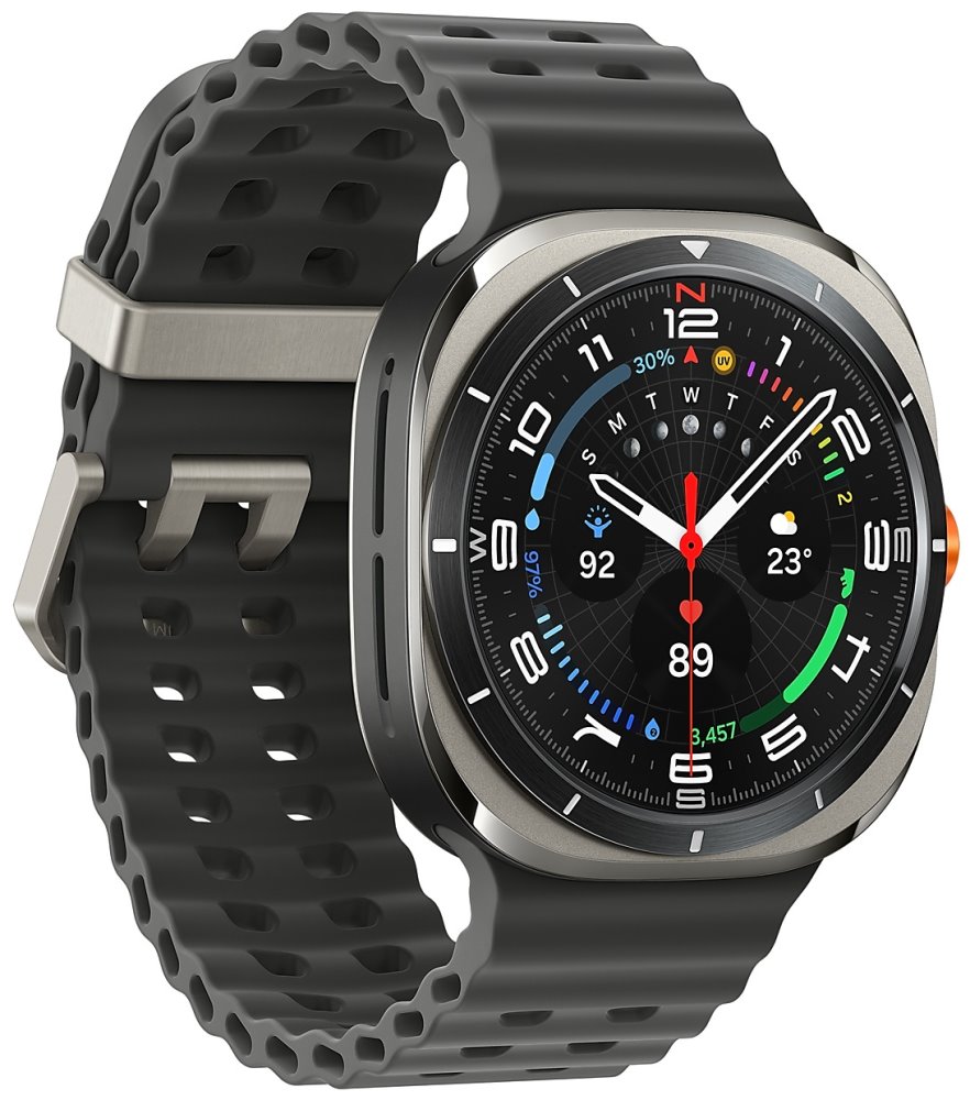 Displej 1,47" (480 x 480), safírové sklo, rám titan, procesor Exynos W1000, RAM 2GB, 64GB paměť, WiFi, Bluetooth, NFC, GPS, voděodolnost 10 ATM, IP68, MIL-STD-810H, baterie 590 mAh, barometr, akcerometr, gyroskop, světelný senzor, tepová frekvence, EKG, bezdrátové nabíjení